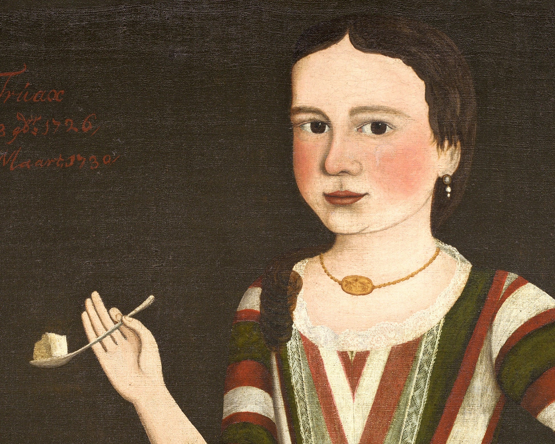 American folk art portrait | Vintage girl fixing tea with rose | Americana wall art | 18th century fashion plate | Kitchen wall art