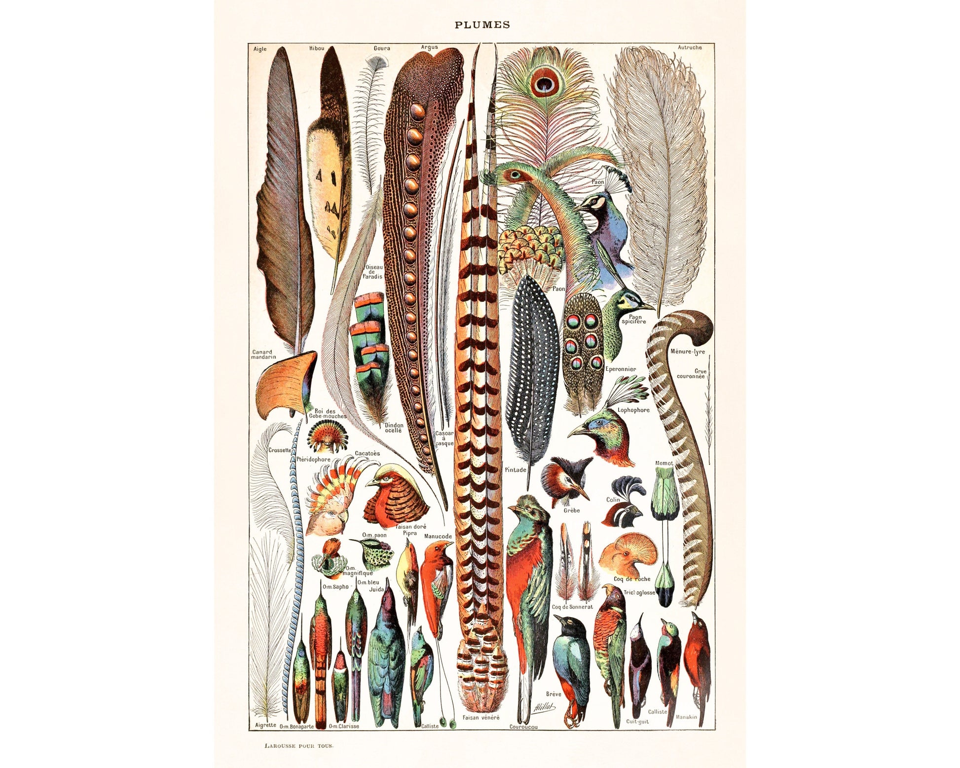 French plumes art print | Vintage feathers and birds | Le Larousse dictionary illustration | Adolphe Millot | Natural history wall art