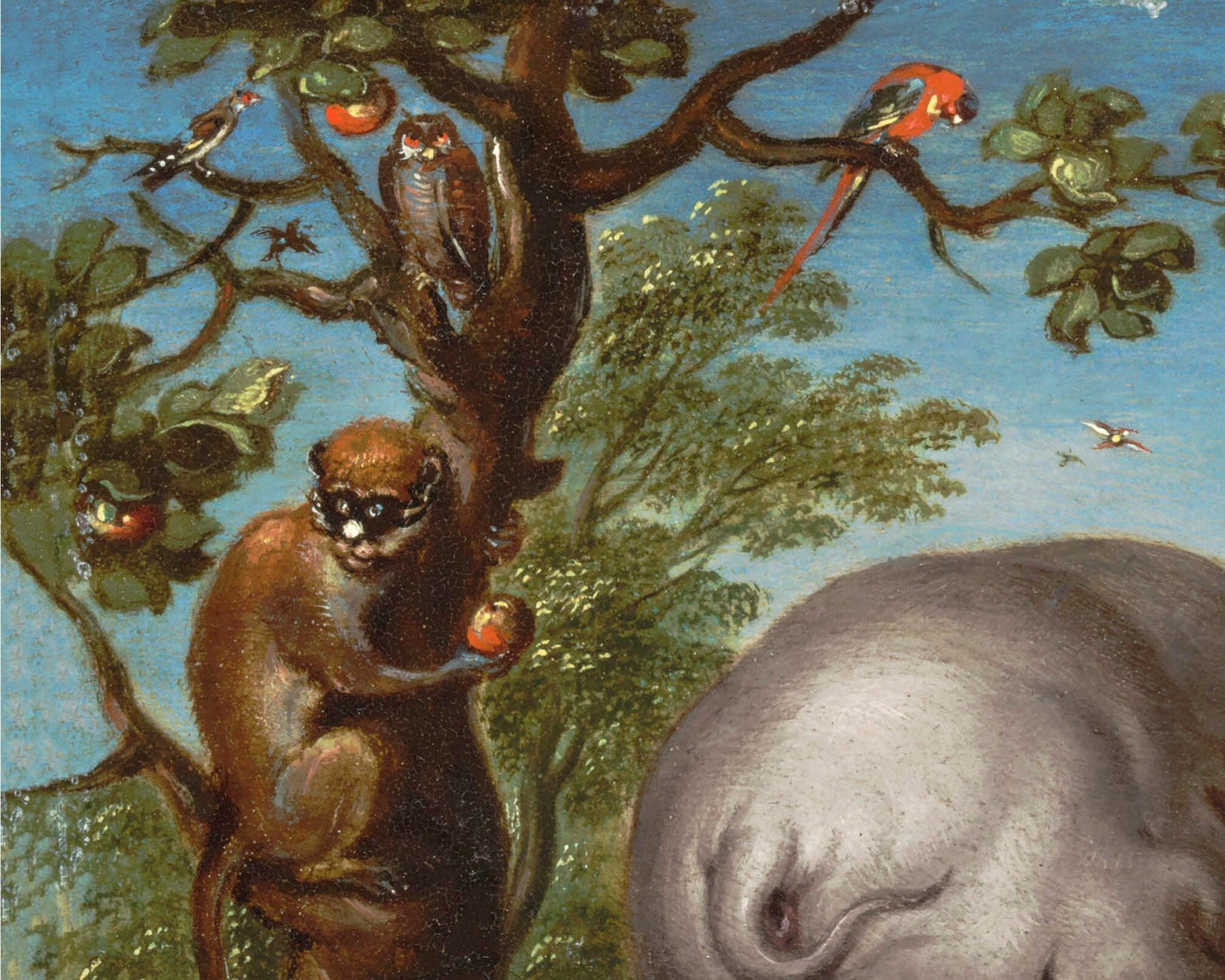 Mythical beasts art print | Elephant fighting a dragon | Unicorn, gryphon, snake. lion, owl, monkey | Magical beasts art | Roelant Savery