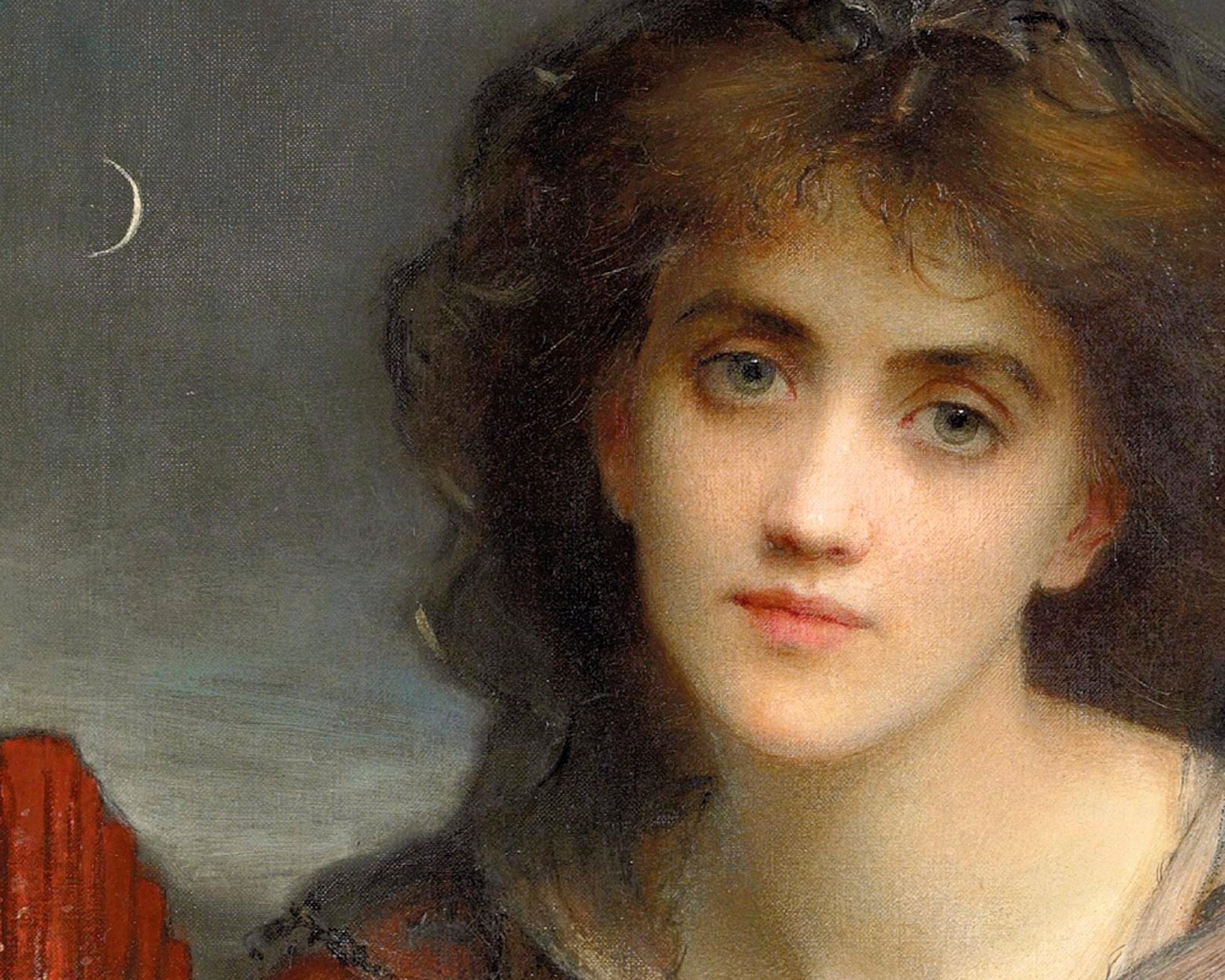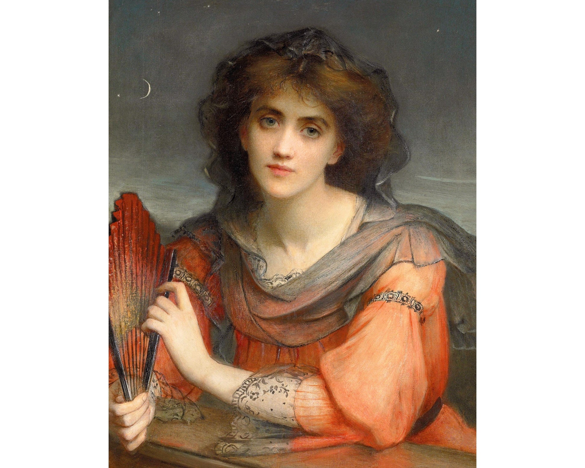 Woman with a fan | Luna | Charles Edward Halle | Crescent moon in art | Pre-Raphaelite wall art | Vintage mystical art print